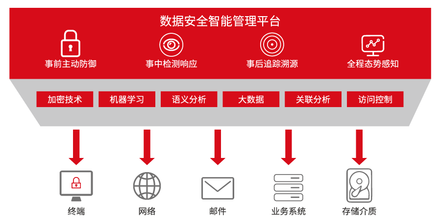 亿赛通数据安全智能管理平台是一款融合机器学习、关联分析、密码技术、访问控制、数据标识等多种技术的综合性数据安全防护产品,该产品以数据为中心,分类分级为基础,为用户数据资产提供事前主动防御、事中实时监测、事后追踪溯源、全程态势感知,基于数据的全生命周期提供全方位、立体化防护。