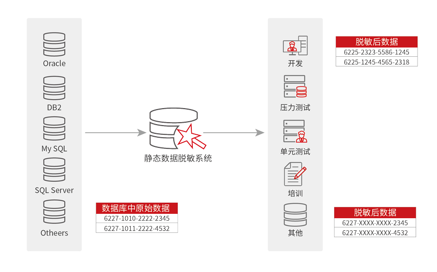 静态数据脱敏系统支持当前主流数据库与文件作为脱敏数据源,数据库包括Oracle、MySQL、SQL Server、DB2等,文件格式包括CSV文件、Dump文件、TXT文件等。本系统无需应用、网络环境改造的前提下,提供可靠数据脱敏服务。